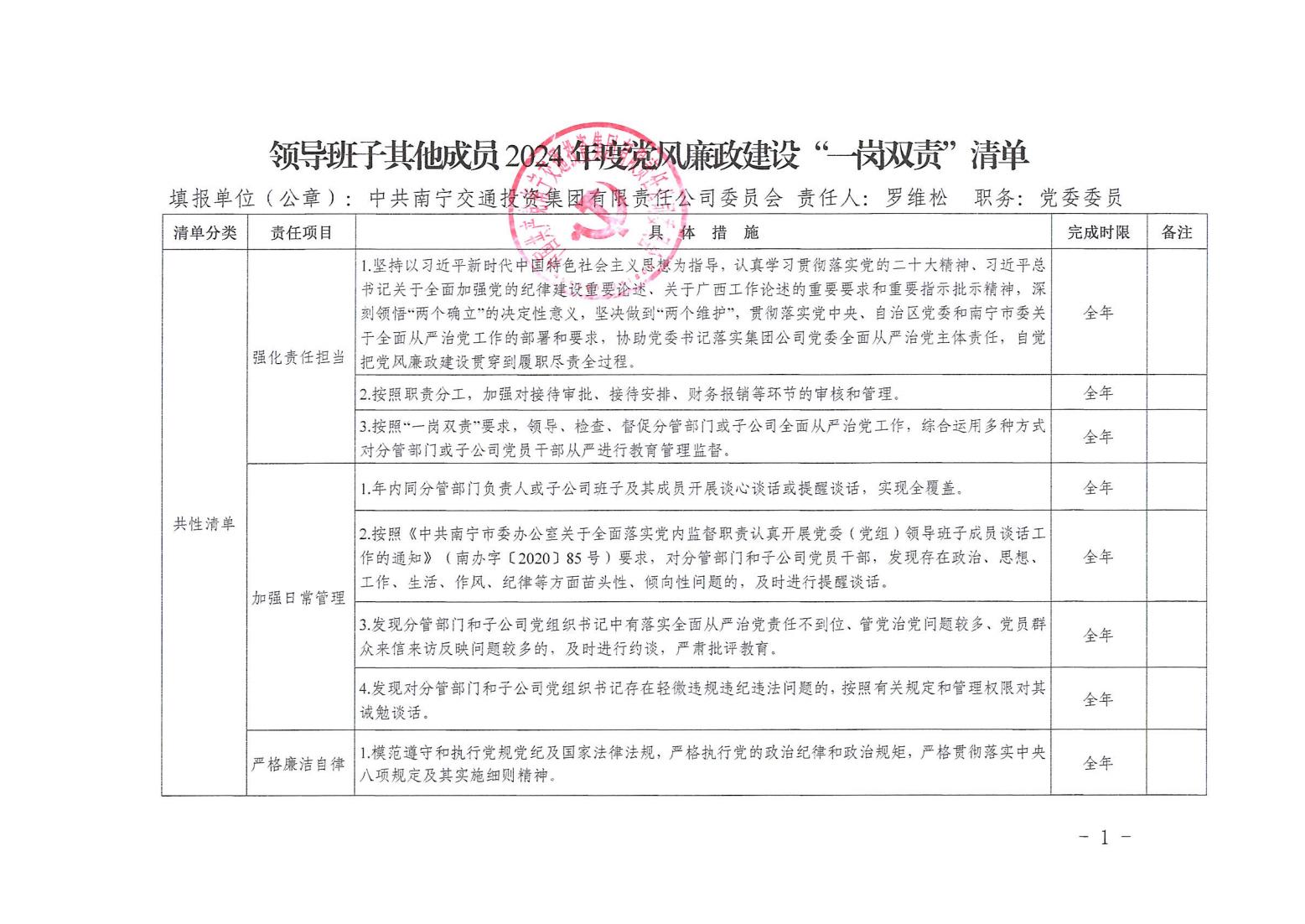 領導班子其他成員2024年度黨風廉政建設“一崗雙責”清單(四)